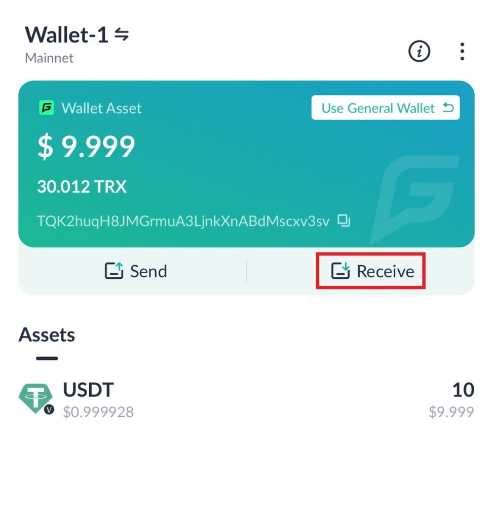 V aplikaci GasFree Wallet klepněte na možnost «Přijměte.» («Receive»).