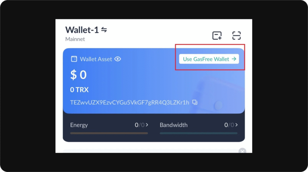 V aplikaci TronLink vyberte možnost «Use GasFree Wallet».