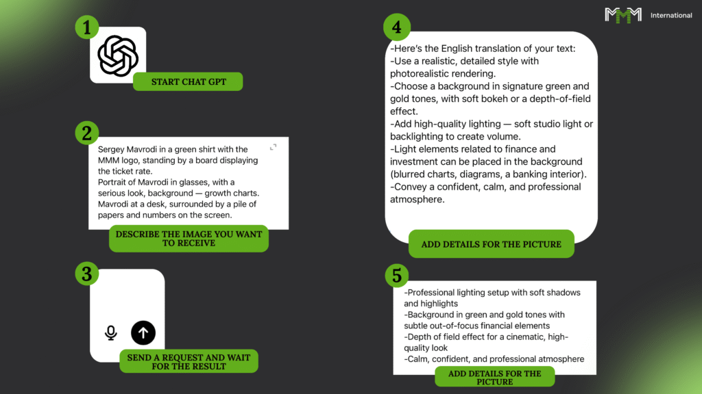 — Мавроди за столом, вокруг кипа бумаг и цифры на экране. - Жмёте отправить и ждёте. 10–30 секунд — и искусственный интеллект выдаст вам образ, который зацепит.
